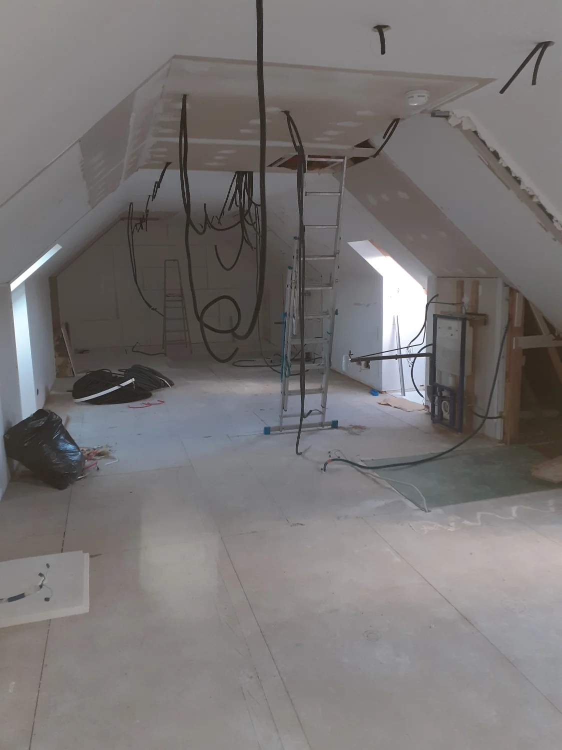 Les combles ont été rénovés avec de nouvelles cloisons et des câbles encore apparents, prêts pour l'installation électrique finale. L'espace est optimisé grâce à la suppression des anciennes séparations, ajoutant luminosité et volume.